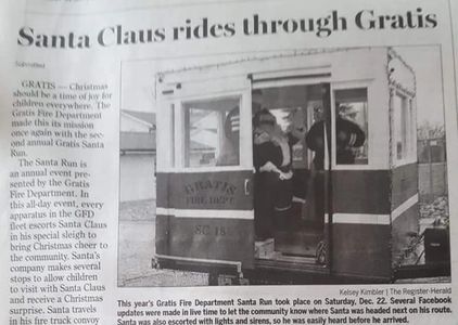 The first-annual Santa Run in Gratis Township started in 2017. We were very grateful to borrow Madison Township's Santa Trailer. In 2018, we realized the Gratis Fire Department needed to provide a Santa Trailer of their own, so the community could always count on seeing Santa at their home. This event helps build trust and community relationships with the Shawnee Fire District as these agencies escort Santa to every home within Gratis Township and the villages of Gratis and West Elkton.