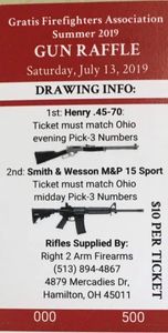 The Gratis Firefighters Association occasionally supports its efforts by selling raffle tickets. Please help us help your community, and contact us today for tickets to our latest raffle!